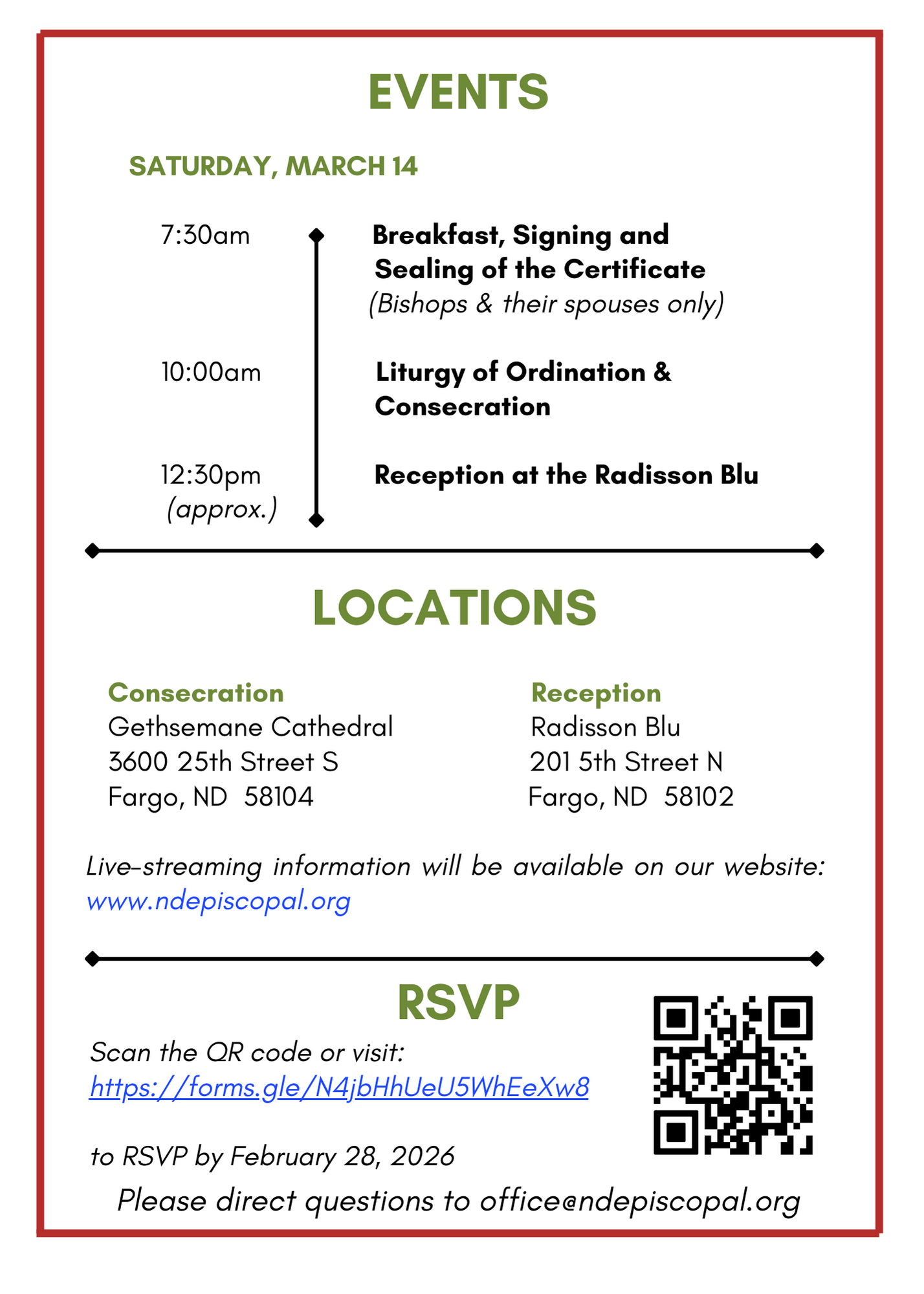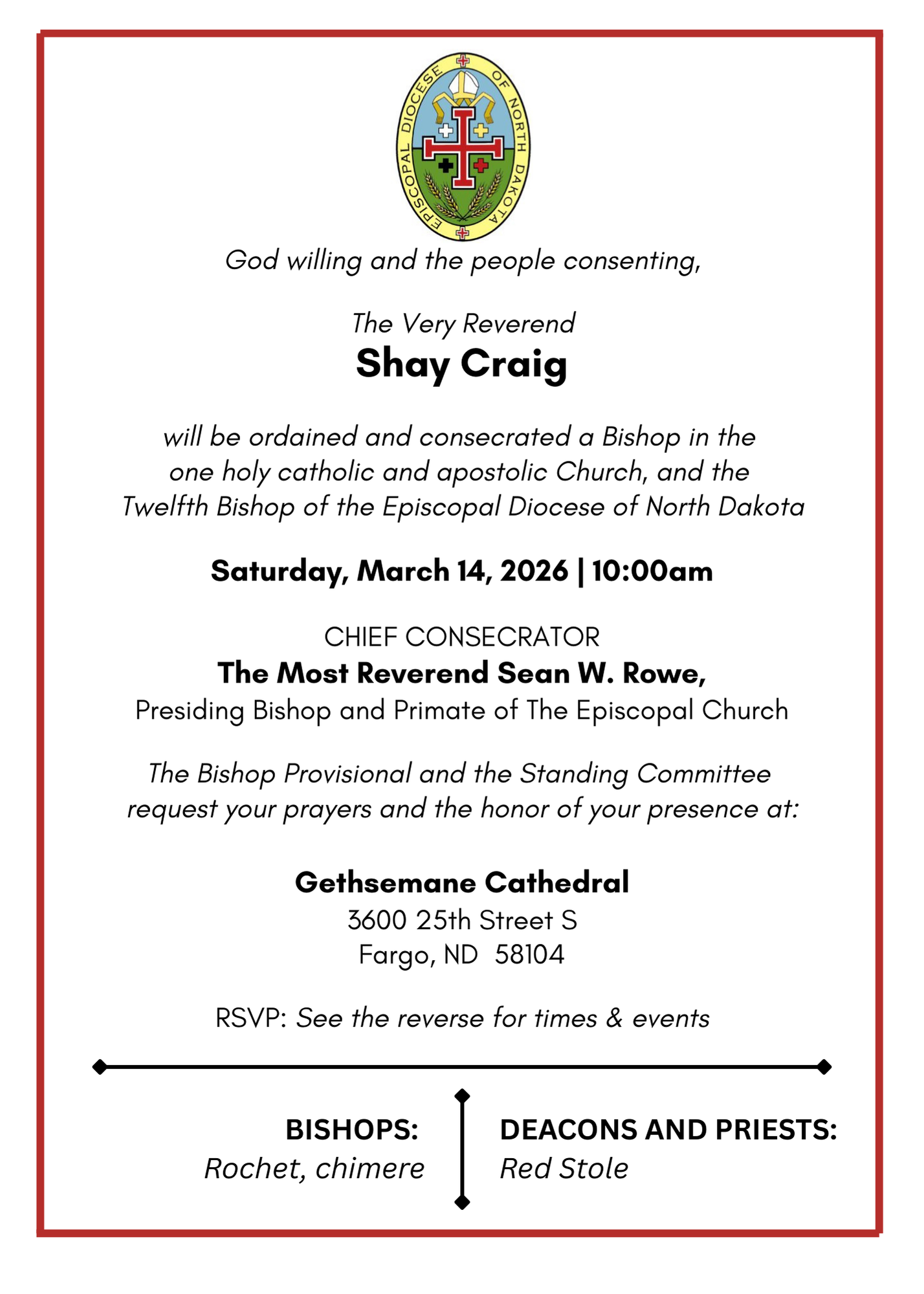 The Bishop Consecration will take place in Fargo, ND on March 14, 2026.